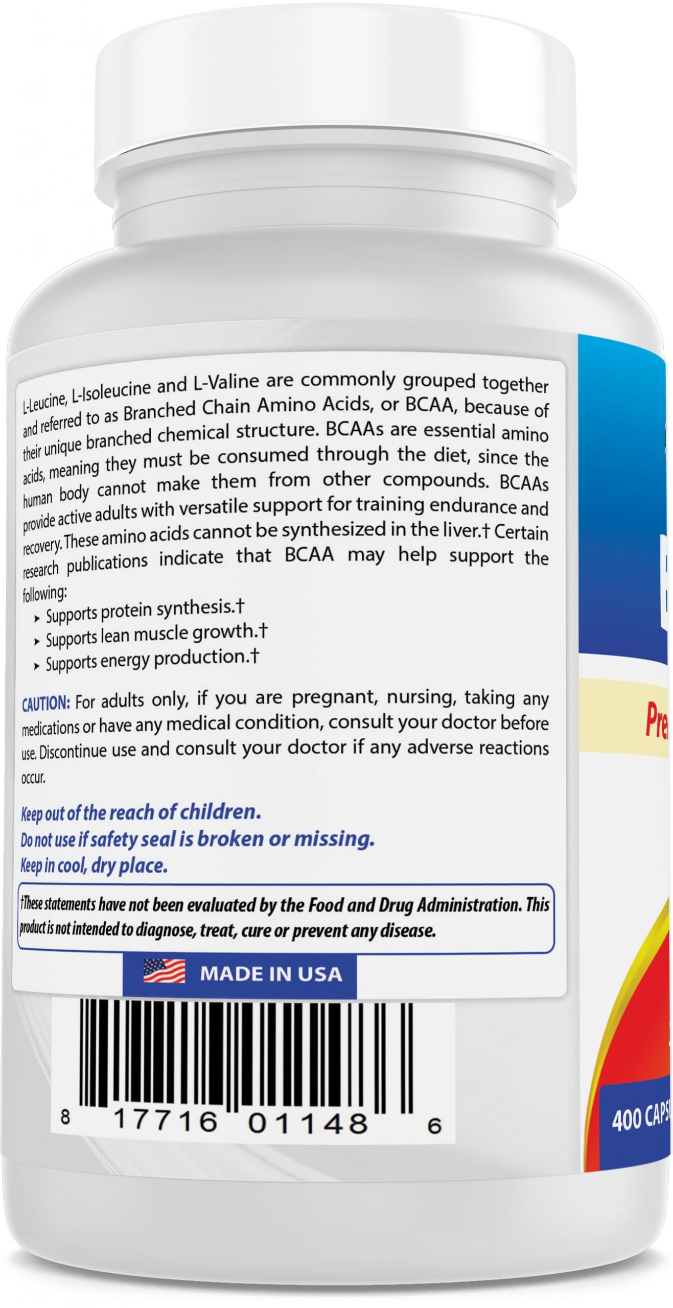 - 3200 mg of BCAA (Branched Chain Amino Acids) per Serving – 400 Capsules per Bottle.