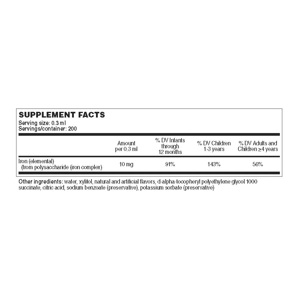 A.C. Grace – Iron Up Liquid Iron Supplement Grape – 2 oz. (60 ml) Supplement Facts Serving Size: 0.5 ml Servings Per Container: 120 Amount per 0.5 ml % DVInfants % DV 4 yrs Iron (elemental) 15 mg 100% 150% 83% (from polysaccharide iron complex) Other Ingredients: water, xylitol, naturla flavors, d-alpha-tocopheryl polyethylene glycol 1000 succinate, ciric acid, sodium benzoate (preservative), potassium sorbate (preservative)/div>