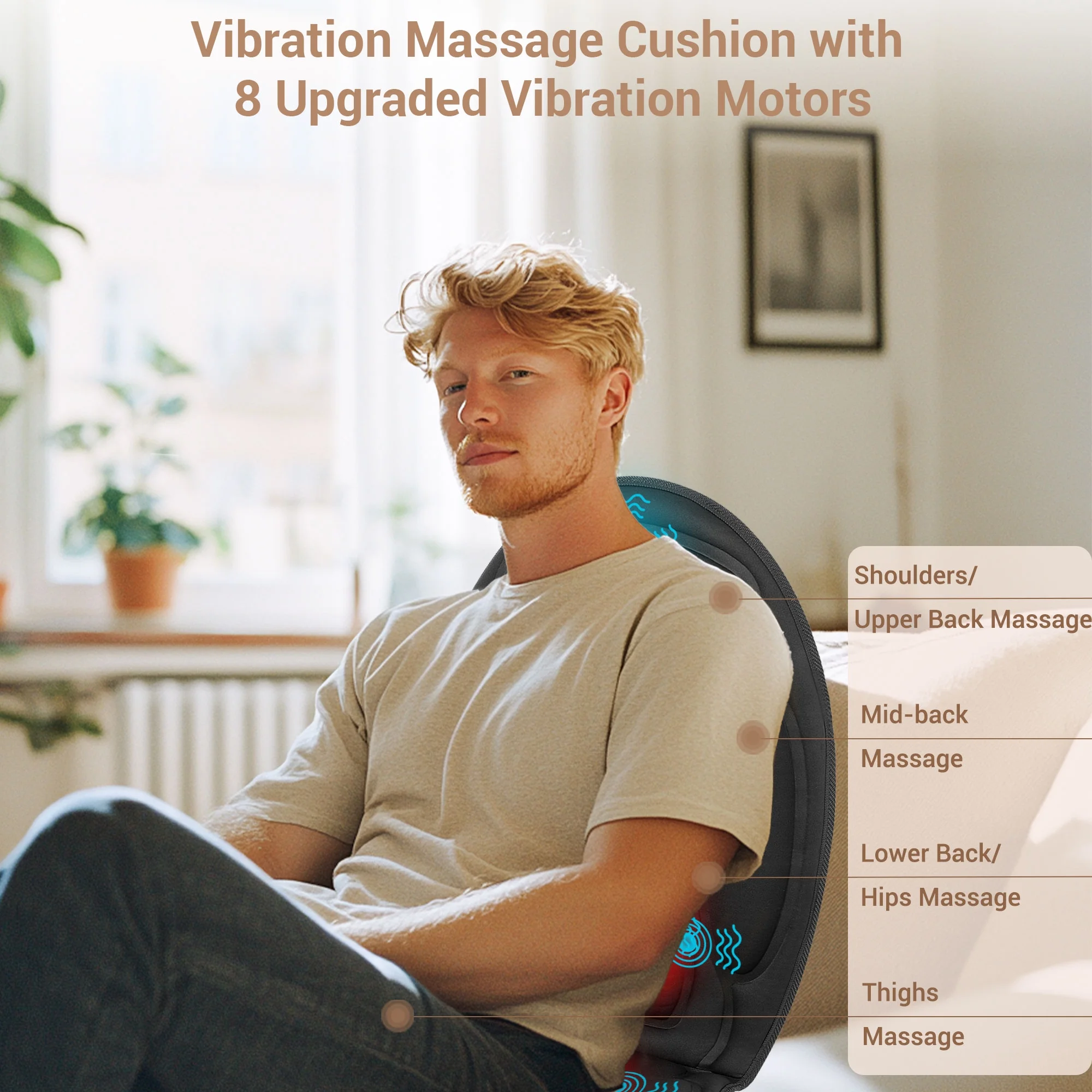 Designed with 8 vibration motors across 3 intensities and 3 target areas, including 2 motors in the upper back, 4 in the lower back, and 2 in the thighs, this massager ensures a full-range massage experience.