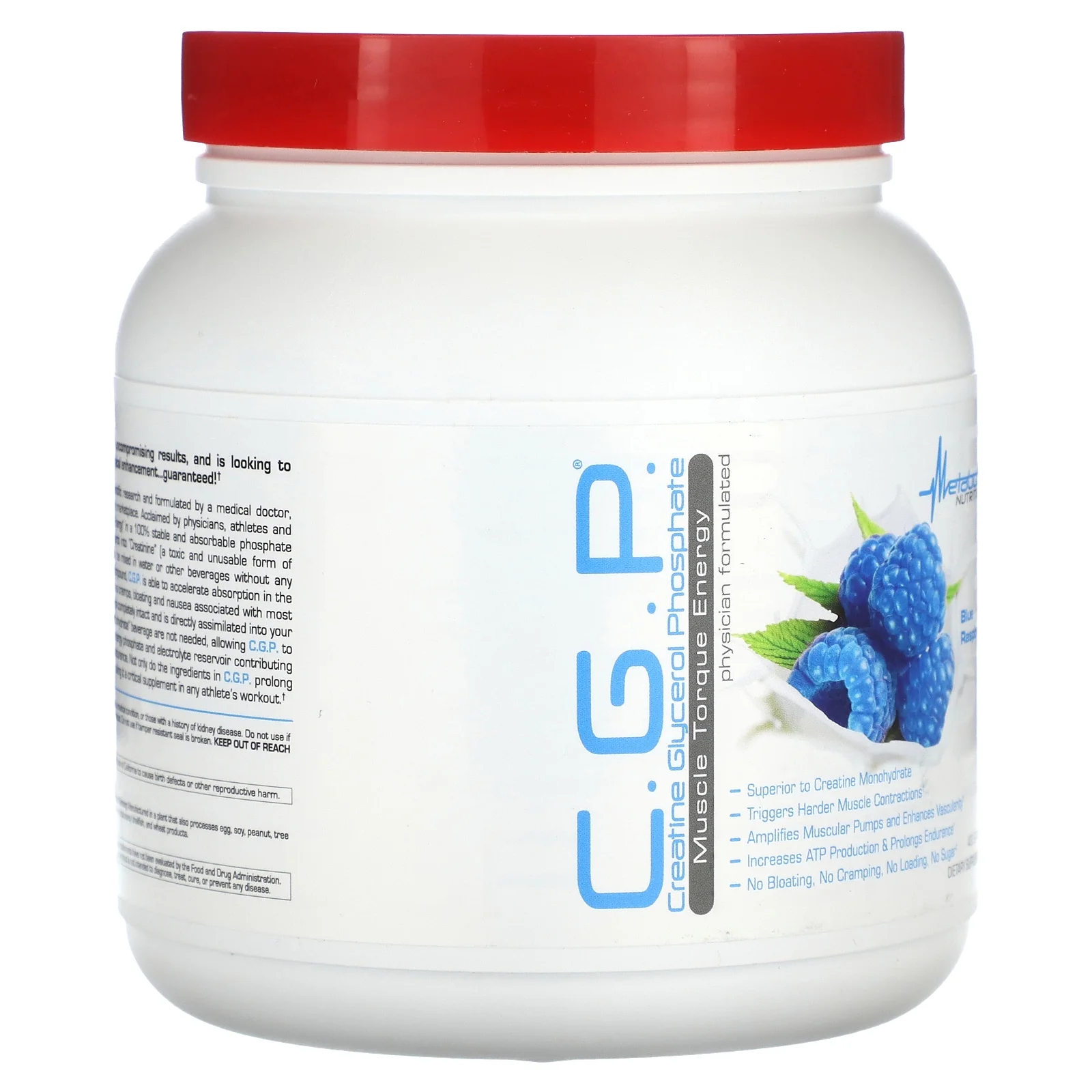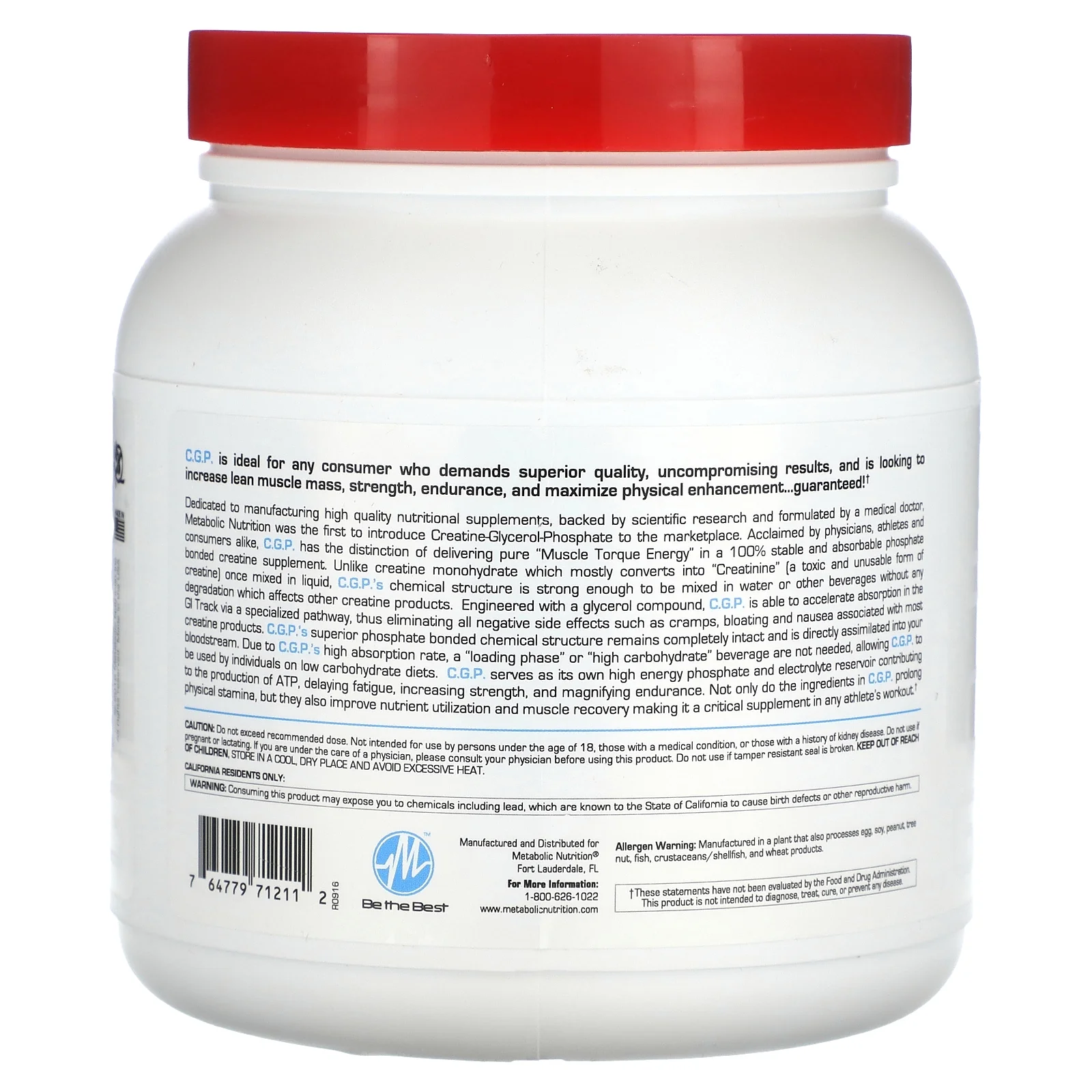 Creatine Glycerol Phosphate Muscle Torque Energy Physician Formulated Superior to Creatine Monohydrate Triggers Harder Muscle Contractions Amplifies Muscular Pumps and Enhances Vascularity Increases ATP Production & Prolongs Endurance No Bloating, No Cramping, No Loading, No Sugar Dietary Supplement Gluten Free C.G.P. is ideal for any consumer who demands superior quality, uncompromising results, and is looking to increase lean muscle mass, strength, endurance, and maximize physical enhancement… guaranteed! Dedicated to manufacturing high quality nutritional supplements, backed by scientific research and formulated by a medical doctor, Metabolic Nutrition was the first to introduce Creatine Glycerol-Phosphate to the marketplace. Acclaimed by physicians, athletes and consumers alike, C.G.P. has the distinction of delivering pure “Muscle Torque Energy” in a 100% stable and absorbable phosphate bonded creatine supplement. Unlike creatine monohydrate which mostly converts into “Creatinine” [a toxic and unusable form of creatine] once mixed in liquid, C.G.P.’s chemical structure is strong enough to be mixed in water or other beverages without any degradation which affects other creatine products. Engineered with a glycerol compound, C.G.P. is able to accelerate absorption in the GI Track via a specialized pathway, thus eliminating all negative side effects such as cramps, bloating and nausea associated with most creatine products. C.G.P.’s superior phosphate bonded chemical structure remains completely intact and is directly assimilated into your bloodstream. Due to C.G.P.’s high absorption rate, a “loading phase” or “high carbohydrate” beverage are not needed, allowing C.G.P. to be used by individuals on low carbohydrate diets. C.G.P. serves as its own high energy phosphate and electrolyte reservoir contributing to the production of ATP, delaying fatigue, increasing strength, and magnifying endurance. Not only do the ingredients in C.G.P. prolong physical stamina, but they also improve nutrient utilization and muscle recovery making it a critical supplement in any athlete’s workout.