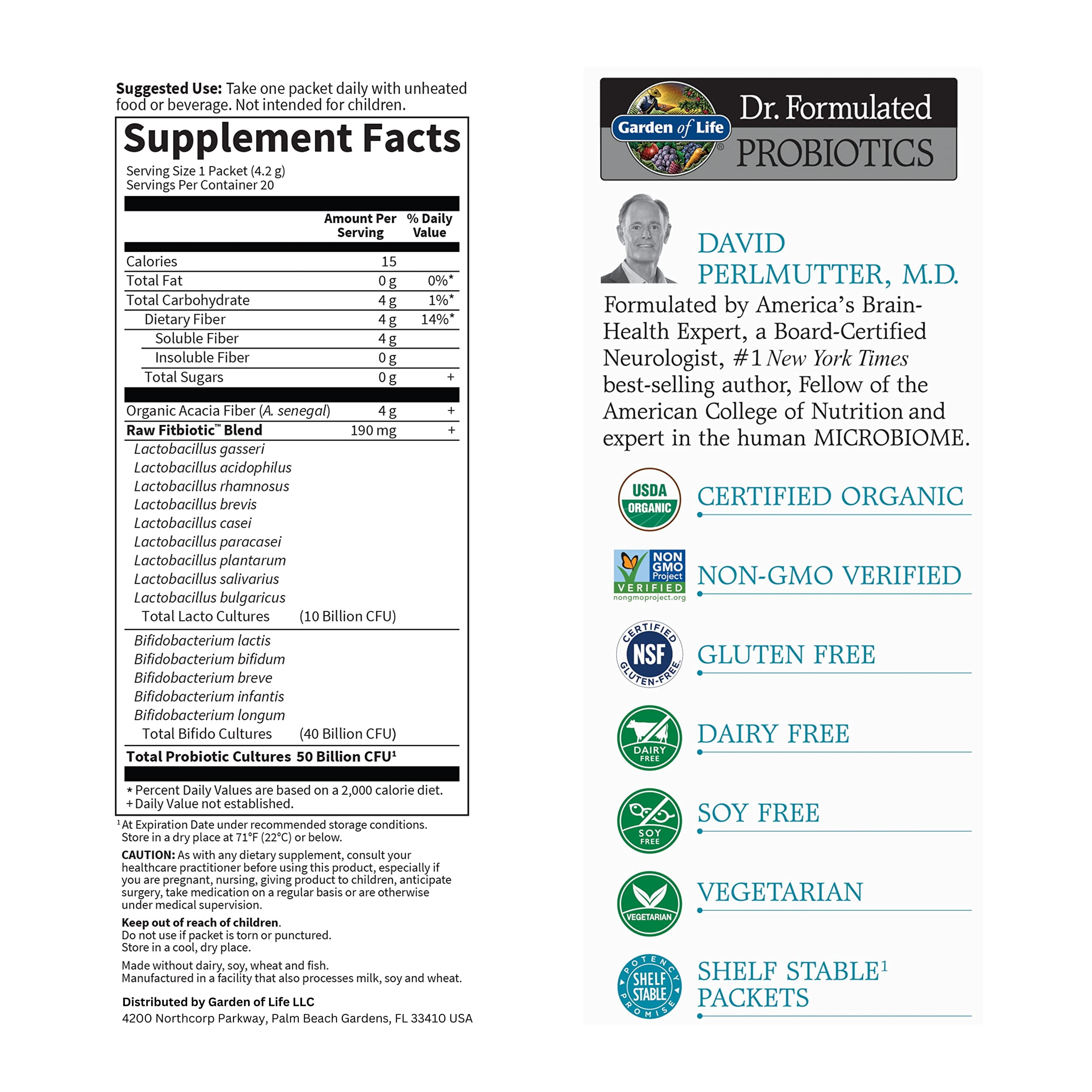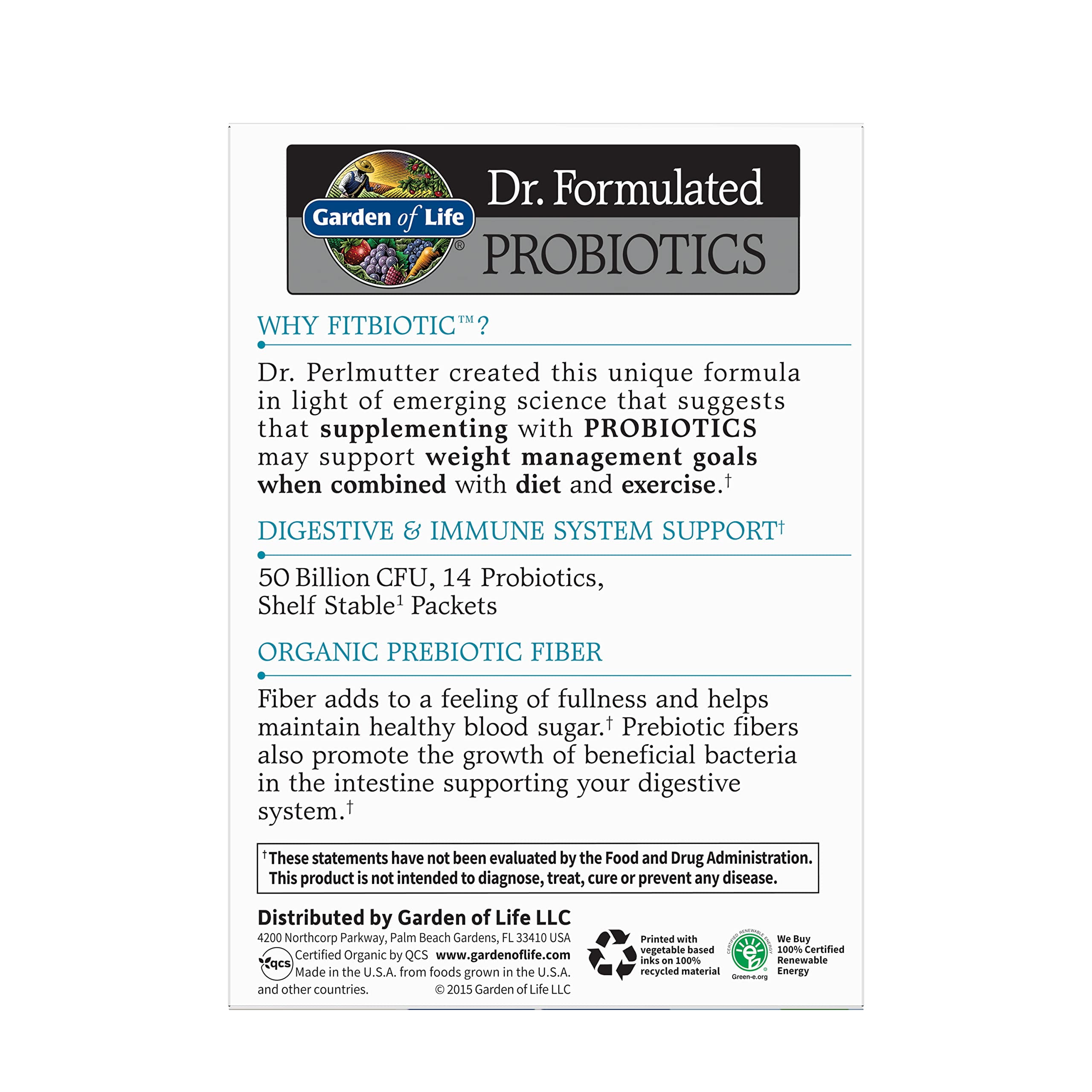 A new approach to weight loss support designed to enhance your current diet and exercise program. For those seeking to manage their weight, Dr. Perlmutter created Fitbiotic, a Certified USDA Organic, unique, raw probiotic formula with 4g of prebiotic fiber from Organic Acacia (A. Senegal), 14 probiotic strains and 50 billion CFU. .