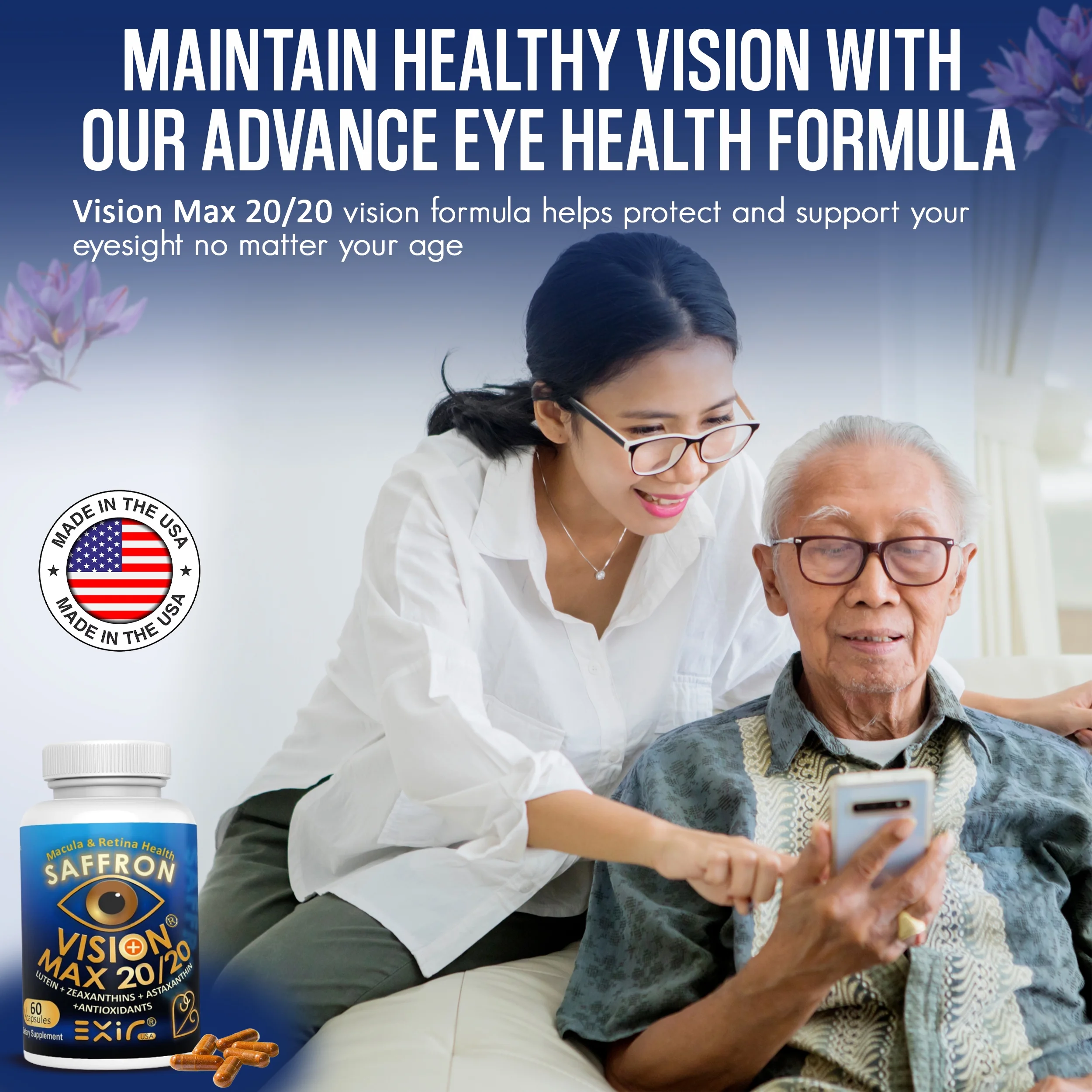 - Complete Eye Health Formula Vision Max 20/20 by Epicure Garden is formulated with Lutein, Zeaxanthin, Saffron, and Astaxanthin to support eye health, promote macular function, and reduce signs of age-related vision decline. It is designed to help protect eyes from daily screen exposure, glare, and digital fatigue.