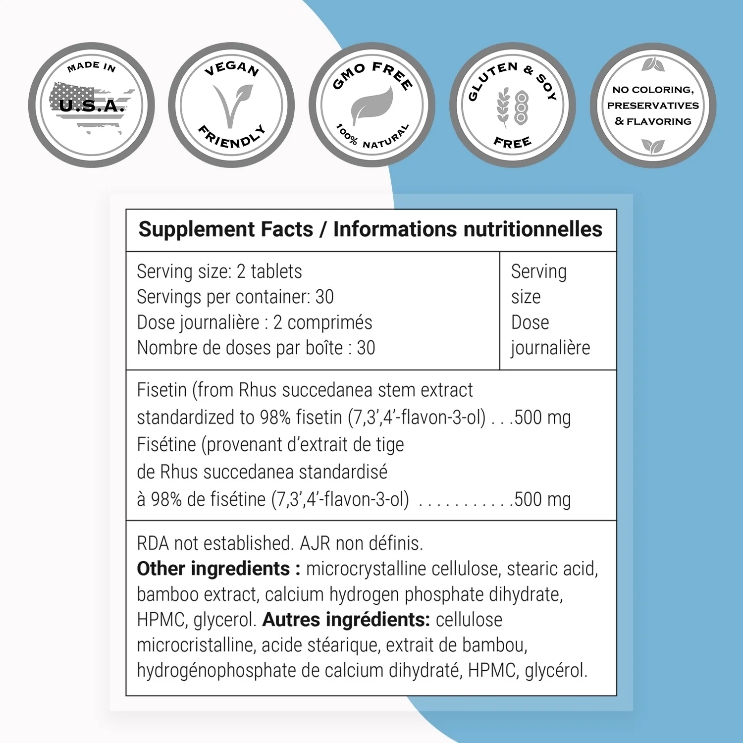 • Recommended Use – Take 2 tablets a day. Each tablet contains 250 mg fisetin. Contains Fisetin from 500 mg of Rhus succedanea stem standardized to 98% de fisetin | Other ingredients: microcrystalline cellulose, stearic acid, bamboo extract, calcium hydrogen phosphate dihydrate, HPMC, glycerol.