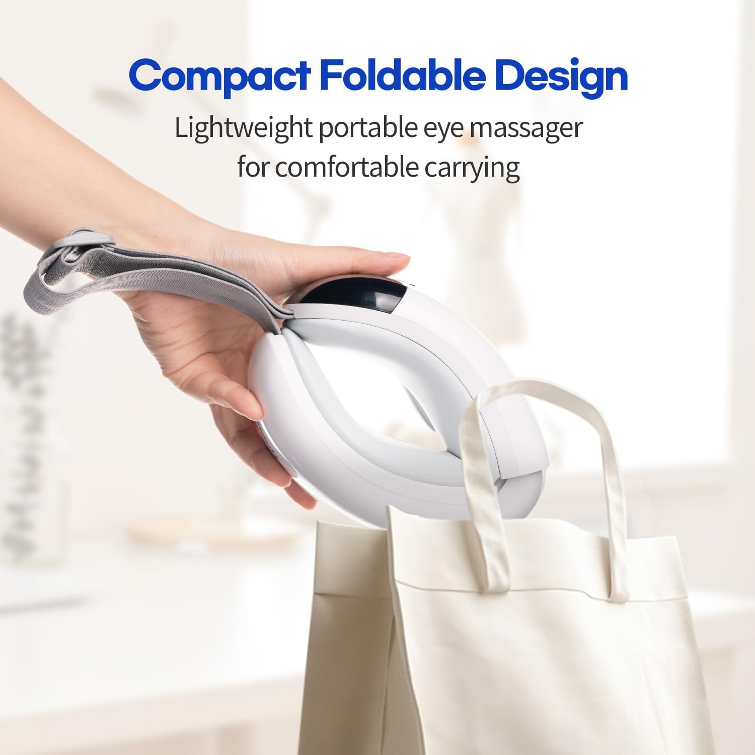 ă180° Adjustable & Portable Designă Our eye massager for migraines can be folded into a smaller one, so you can take it to the office, airplane, or traveling. In addition, the headband can be easily adjusted in size and is suitable for all teenagers and adults. If you feel too tight or too loose, please adjust your headband to find the right size.