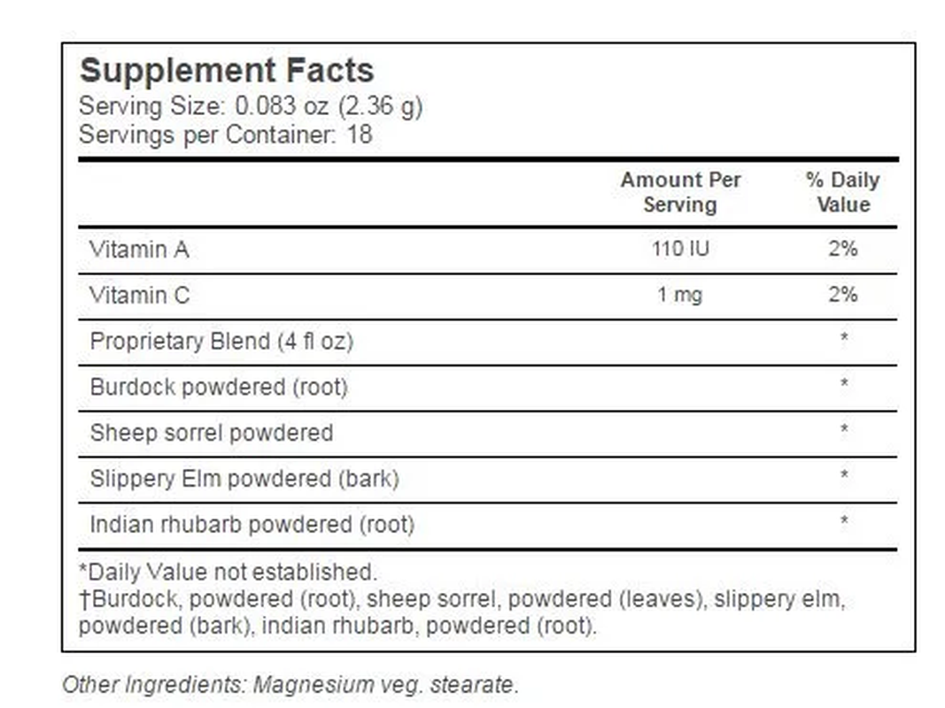 Burdock Root, Sheep Sorrel, Slippery Elm, Indian Rhubarb Root./div>