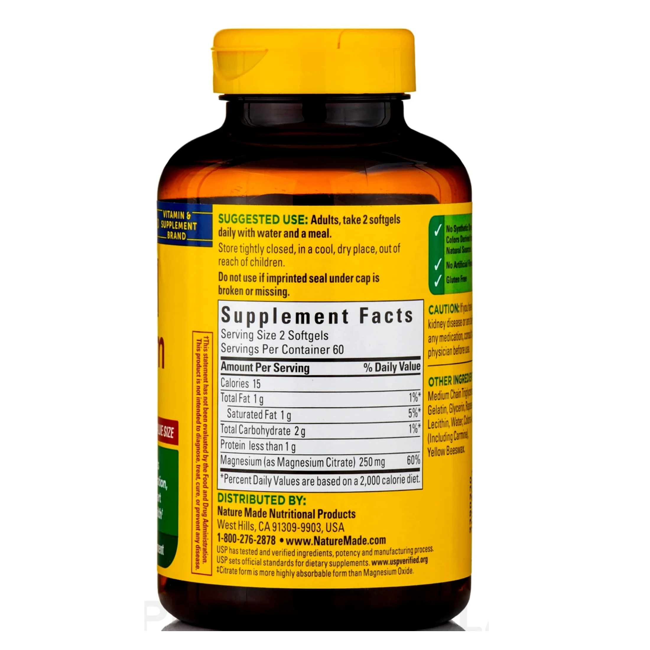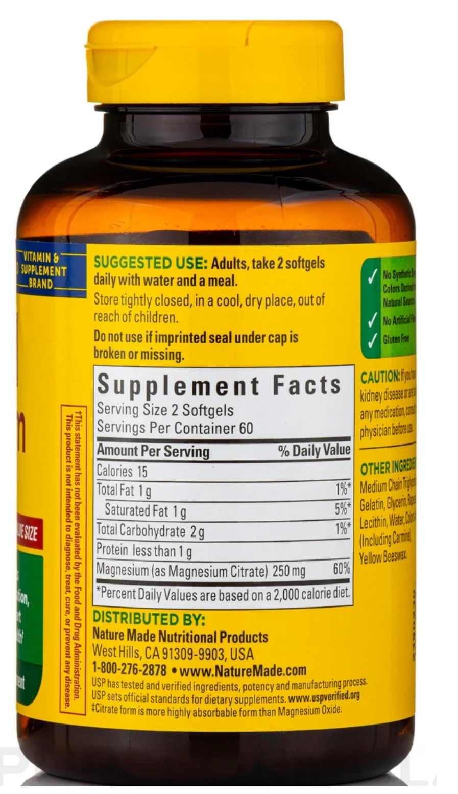 Nature Made® Magnesium Citrate provides magnesium citrate, a more highly absorbable form of magnesium, to help meet daily needs for this essential nutrient. Magnesium participates in more than 300 reactions in the body and is critical to many bodily functions, including support for nerve, muscle and heart function. Magnesium also supports healthy bones and teeth, and helps convert food into cellular energy. Made with colors derived from natural sources.