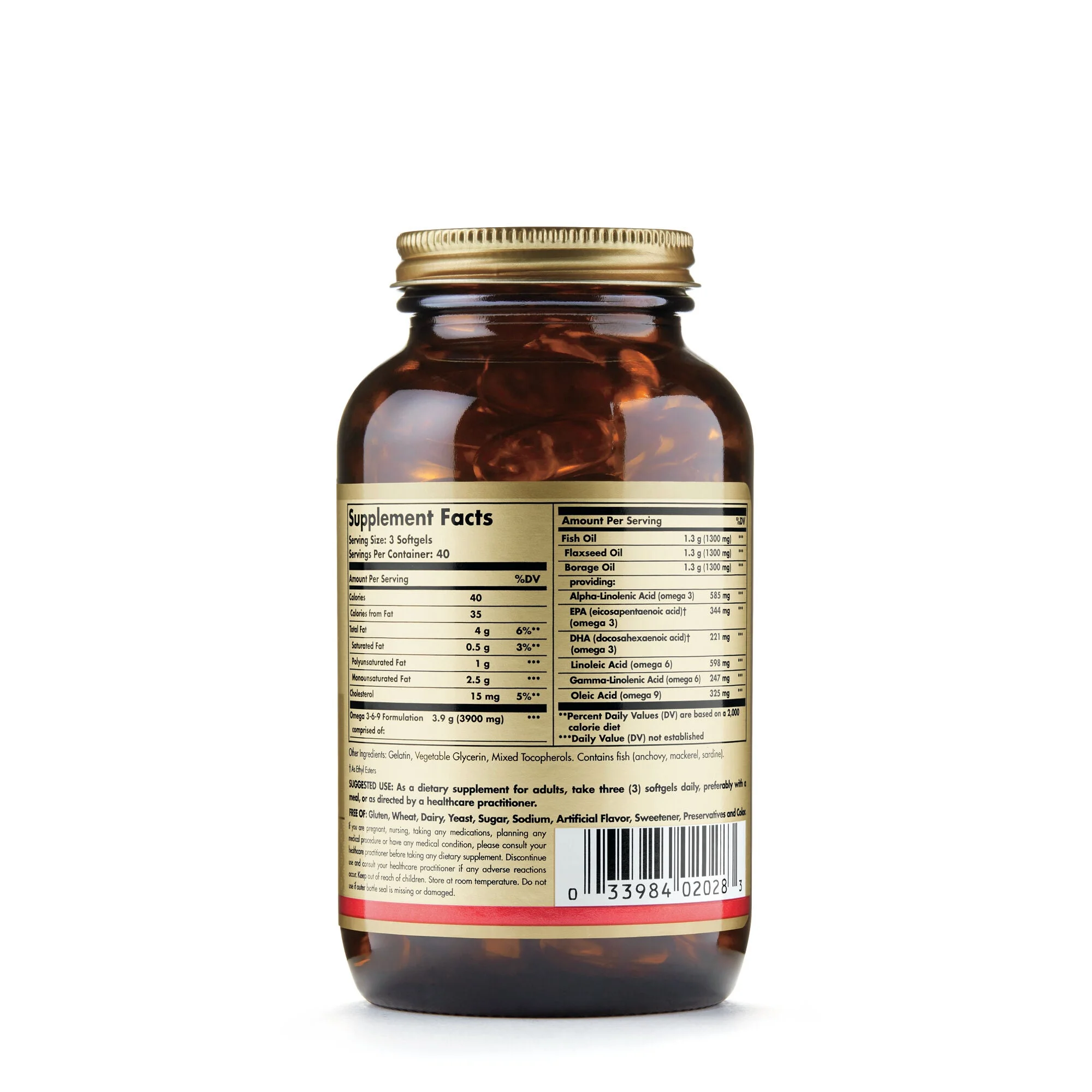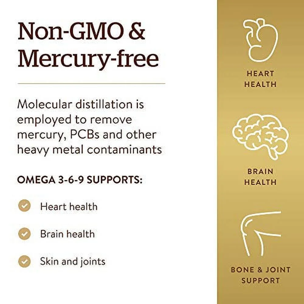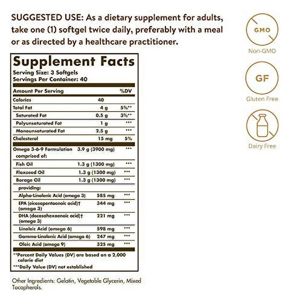 - EFA 1300mg Omega 3-6-9 by Solgar 120 Softgel EFA 1300mg Omega 3-6-9 120 Softgel Product This formula provides a blend of three premium oils Fish Flax and Borage which all contribute essential fatty acids necessary for optimal health and well-being. These essential fatty acids promote the health and function of a variety of organs and systems including those of the heart joints and skin. Molecular distillation is employed to remove mercury PCBs and other heavy metal contaminants. Suggested Use As a dietary supplement adults take three (3) softgels daily preferably with a meal – Or as directed by your healthcare professional. Supplement Facts Serving Size 3 Softgels Servings Per Container 40 Amount Per Serving Daily Value Calories 40 Calories from Fat 35 Total Fat 4 g 6 Saturated Fat 0.5 g 3 Polyunsaturated Fat 1 g Monounsaturated Fat 2.5 g Cholesterol 15 mg 5 Omega 3-6-9 Formulation comprised of – 3.9 g (3900 mg) Fish Oil 1.3 g (1300 mg) Flaxseed Oil 1.3 g (1300 mg) Borage Oil 1.3 g (1