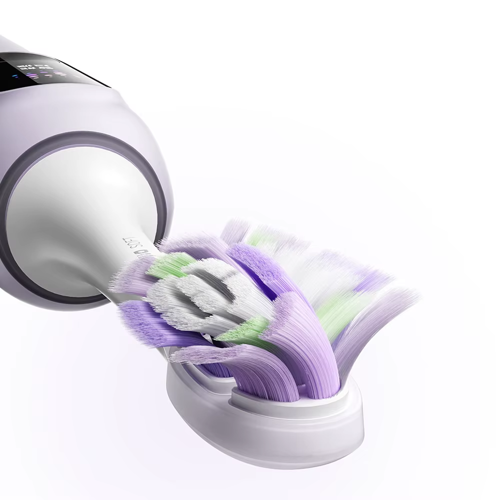 The cleaning brush head features a dual-roller design*, closely fitting the tooth surface to meet daily cleaning needs; the caring brush head has a circular wrap layout to protect the gums and gently care for sensitive teeth.