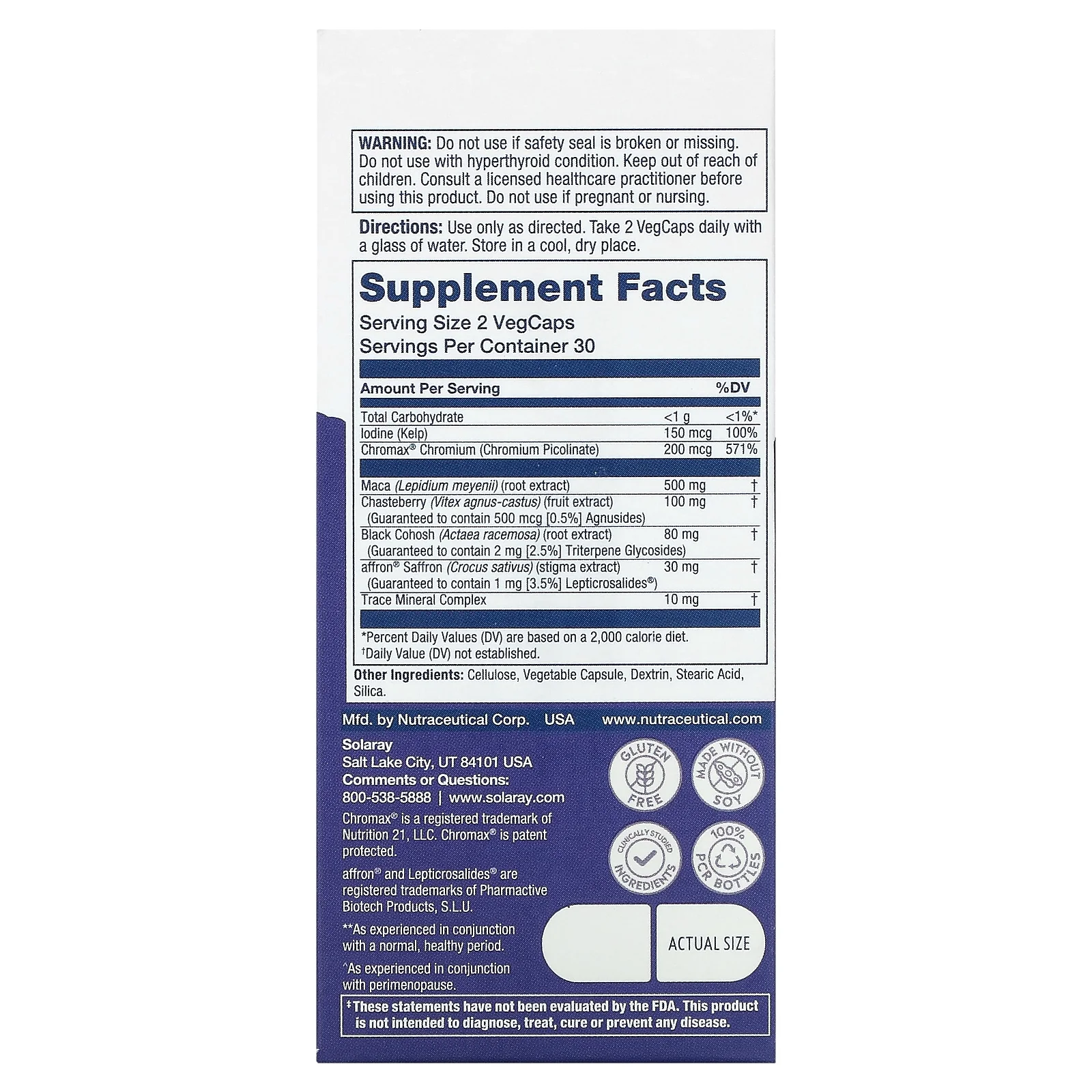 A New Lease on Midlife. It’s a unique time in your life, so you need a unique solution. Turn to this doctor-formulated supplement—delivering targeted support for top perimenopause symptoms and concerns—for help finding comfort while you navigate your now.* This STAGES solution is anchored by black cohosh and scientifically backed saffron, shown in numerous clinical studies to support perimenopause symptoms, mood, and sleep.‡* This doctor-formulated product is ideal for those seeking menopause supplements for women. As a woman who’s been practicing medicine for over 30 years, renowned MD Pamela Peeke knows a little something about women’s health. Along with the women of our innovation team, she put her lifetime of knowledge and experience into formulating STAGES—for efficacious solutions you can truly trust. Like all Solaray products, our Perimenopause product is lab verified for potency, purity, and identity. Confidence in the Solaray name is just one of the reasons we’ve been around so long and maintain our place as a leader in the industry. Unlike many other companies, we manufacture almost all our own products in our GMP-certified facility and thoroughly test and screen raw ingredients in our state-of-the-art in-house lab for the slightest amount of impurities. This allows us to manage the production process from beginning to end so we can provide the best possible quality. Rest assured, only the purest formulas ever reach your cabinet. And because we are always committed to leaving the world a little better than we found it, we package this product in 100% post consumer recycled plastic bottles. † As experienced in conjunction with a normal, healthy period. ‡As experienced in conjunction with perimenopause.