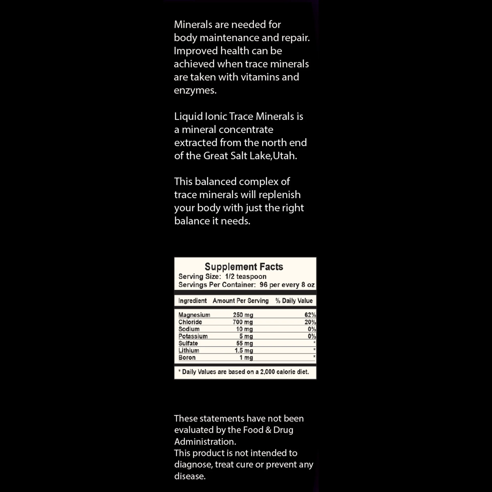 Cellular Energy Focus supplements our bodies with full spectrum angstrom size minerals. Minerals are essential for good health. The body utilizes and requires over 80 minerals for complete balanced health. Every living cell depends on minerals for proper structure, function and electrical conductivity. Minerals in Cellular Energy Focus support the formation of blood, bones and the proper composition of body fluids. They further support healthy nerve function, proper operation of the cardiovascular system. Almost all enzyme reactions in the body require minerals. Our soil no longer features most of the minerals we need. This keeps us from receiving a majority of these minerals in our diet. Cellular Energy Focus contains 80 +naturally occurring elements contained in sea water. It provides our bodies with the minerals our body needs for vibrant health.