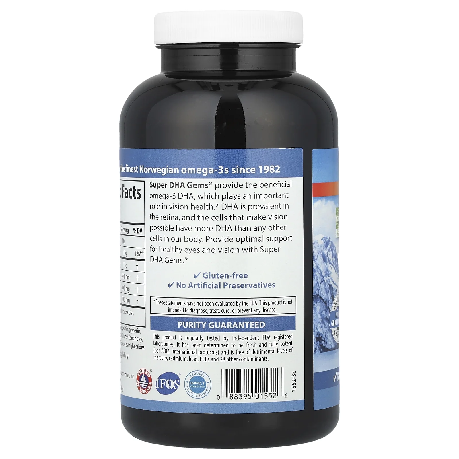 Norwegian Fish Oil Concentrate 500 mg DHA Igen – Non-GMO Tested Purity Guaranteed – Freshness & Potency Dietary Supplement Brain Function Vision Support Joint Health Carlson Providing the Finest Norwegian Omega-3s Since 1982 An FDA Regulated Facility Gluten-Free No Artificial Preservatives Friend Of The Sea© IFOS™ Super DHA Gems® provide the beneficial omega-3 DHA, which plays an important role in vision health. DHA is prevalent in the retina, and the cells that make vision possible have more DHA than any other cells in our body. Provide optimal support for healthy eyes and vision with Super DHA Gems.
