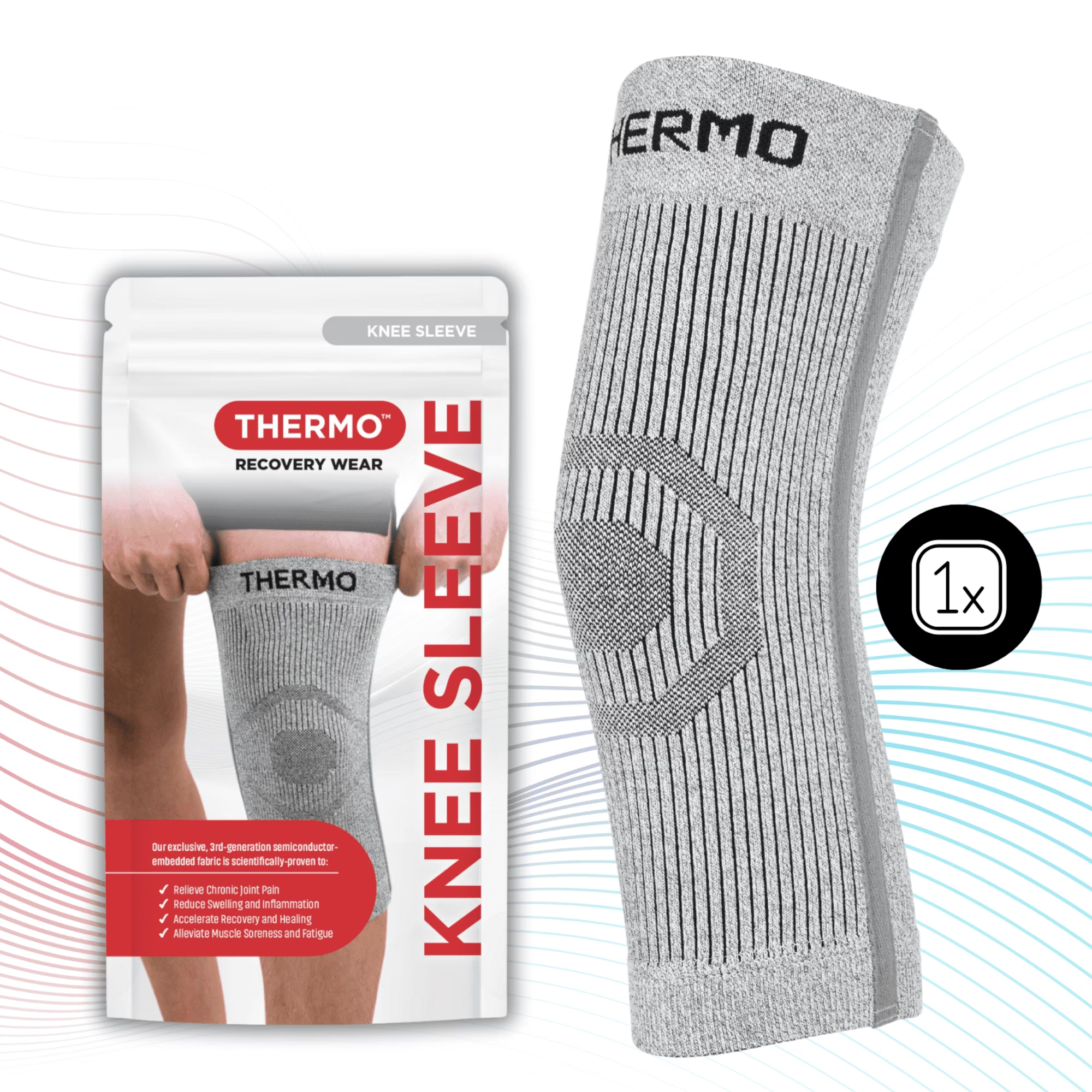Experience less aches and all-day comfort with the Thermo™ Classic Recovery Knee Sleeve. Crafted with breathable, non-compressive performance fabric, this unisex knee sleeve is designed for everyday wear, post-workout recovery, reducing swelling, and joint comfort. Thermo’s Bioactive Infrared Fabric™ Technology is built with semiconductor-embedded material that emits infrared energy to promote healthy circulation and reduce inflammation, while helping to ease muscle soreness, stiffness, and joint discomfort. Unlike standard copper or compression sleeve products, it’s designed to address the root causes of discomfort rather than just applying surface-level pressure. Whether you’re recovering from physical activity, managing arthritis symptoms, or in need of extra comfort during daily movement, this knee sleeve offers optimal support without restricting mobility. Ergonomically designed with single support stays to maintain shape and enhance fit. Suitable for day or night wear.